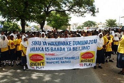 Wanafunzi wakike kutoa shule mbalimbali wakiwa wameshika bango lenye ujumbe wa unaoelezea miaka 15 ya mafanikio ya wanawake baada ya mkutano wa kimataifa uliofanyika Beijing nchini China.